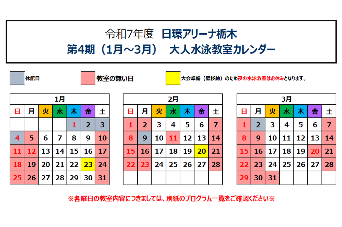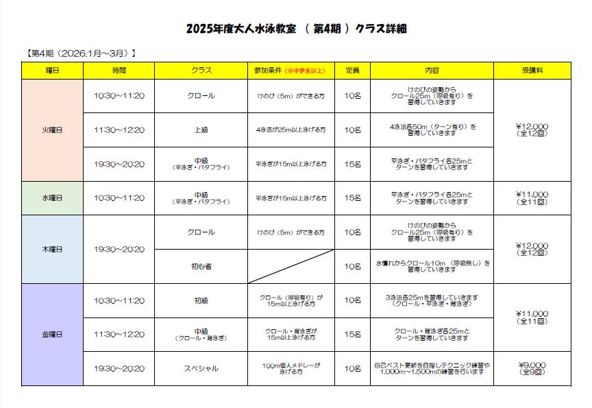 第4期(2026年1~3月)大人水泳教室を開催いたします!