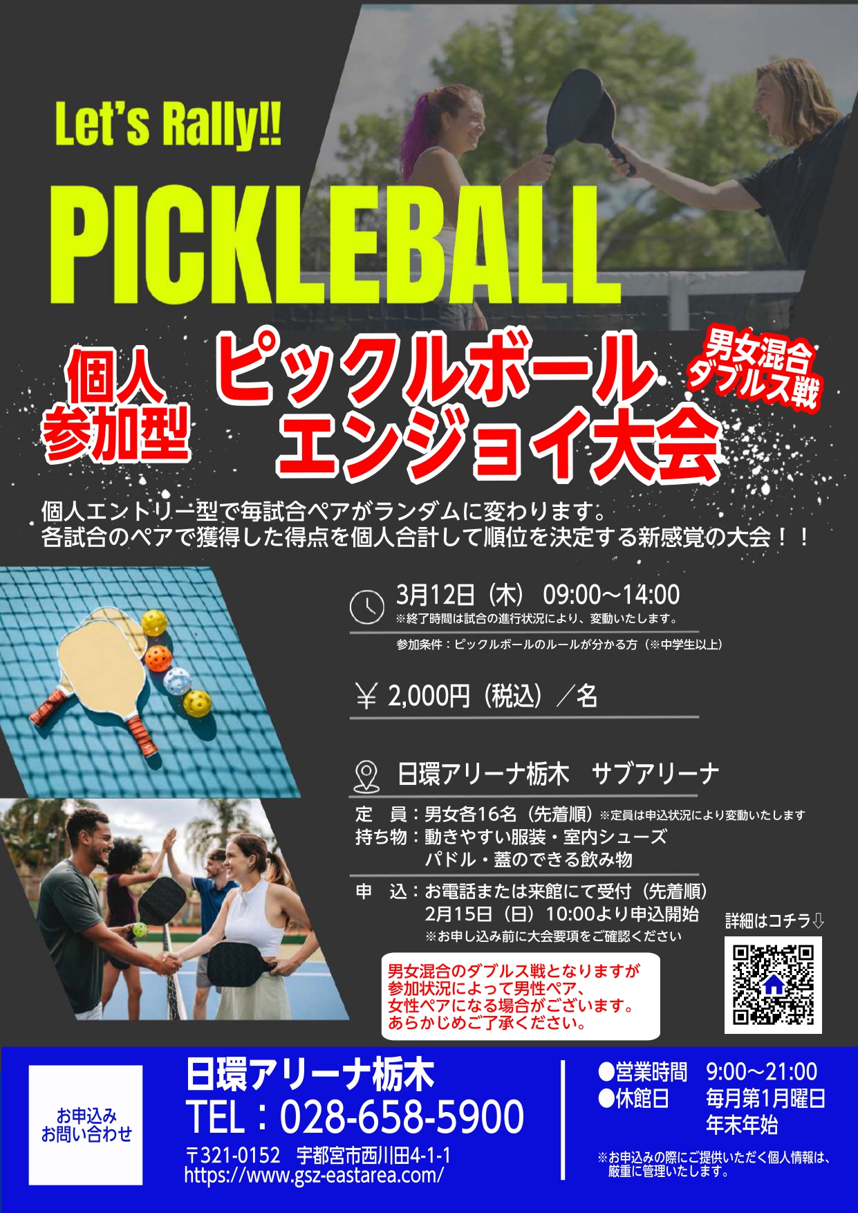 2026年3月12日(木)に個人参加型のピックルボールエンジョイ大会を開催いたします。