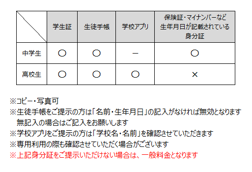中学生 ・・・ 学生証または生年月日が記載されている身分証の提示