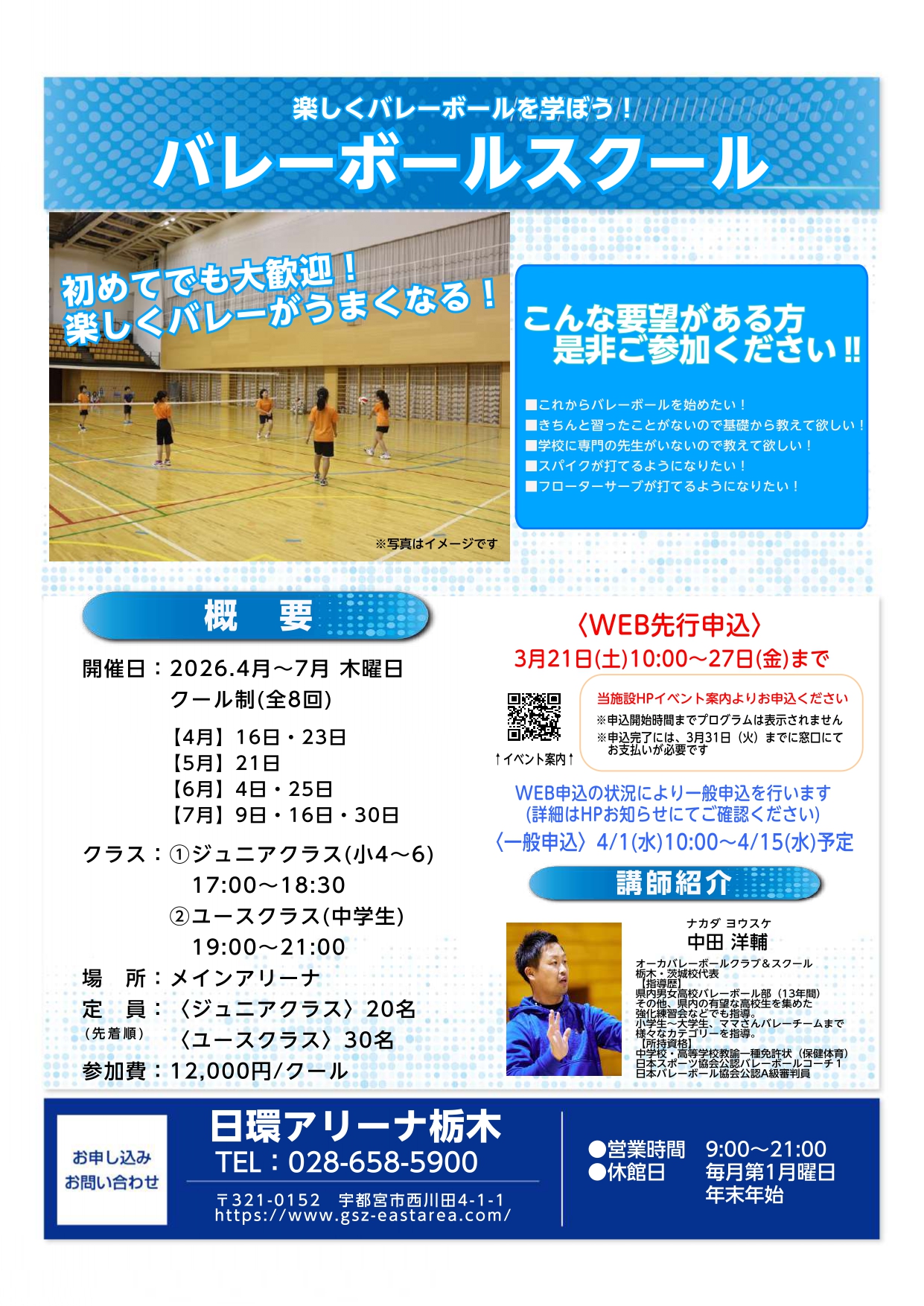 2026年4~7月も、小・中学生向けのバレーボールスクールを開催いたします。